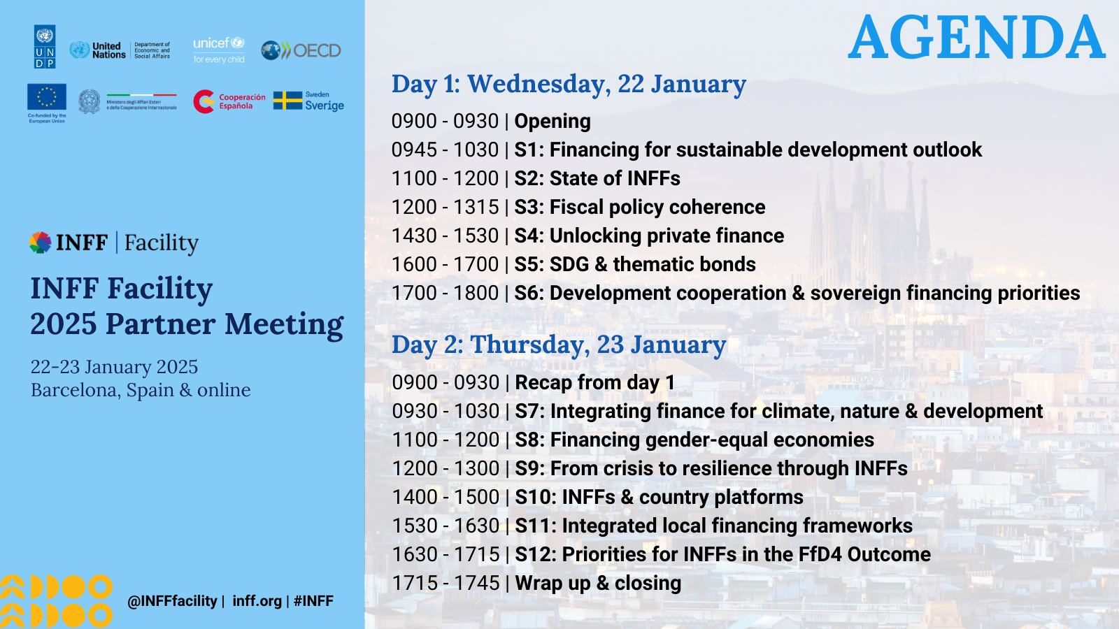 The 2025 INFF Facility Partner Meeting will be hosted in Barcelona by the Government of Spain in collaboration with the regional Government of Catalonia. This two-day event will bring together partners from all sectors from the country, regional and global levels to exchange and discuss priorities for country-led INFFs beyond 2025.