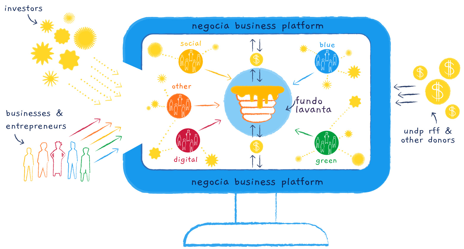 Figure 1. From a revolving fund of $300,000 from the UNDP Rapid Financing Facility, Fundo Lavanta awards entrepreneurs US$1,500 to $15,000 in seed funding to start or scale businesses that fall within five categories: green, blue, digital, social and others with inclusive growth and job-creation potential. Once they’ve created a profile on the Negocia platform, entrepreneurs can make connections with other investors looking to support projects that align with the SDGs.