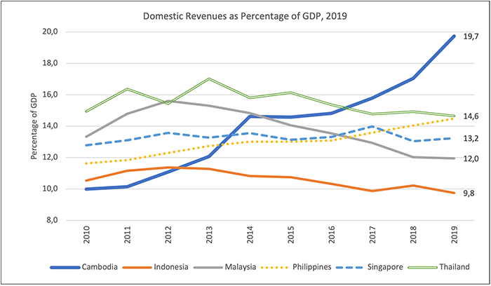 Figure 2: Consistent reforms in tax policy and administration over two decades have yielded positive results. Domestic tax revenue increased from 10.0 per cent of GDP in 2010 to 19.7 per cent in 2019. This makes Cambodia among the best performers in the ASEAN region.