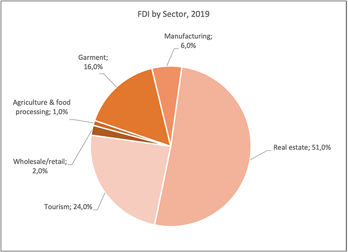 Figure 4: FDI investments in Cambodia are mainly concentrated in a few subsectors: garments, tourism, and real estate. In 2019, the construction and real estate sector received the largest share of 51 per cent of total approved FDI.